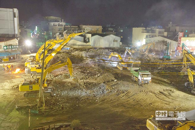 维冠大楼倒塌,报案协寻的人员在13日下午全部寻获,13日晚间现场已几乎清理为平地,即将展开重建之路。(图片来源:台湾《中时电子报》)