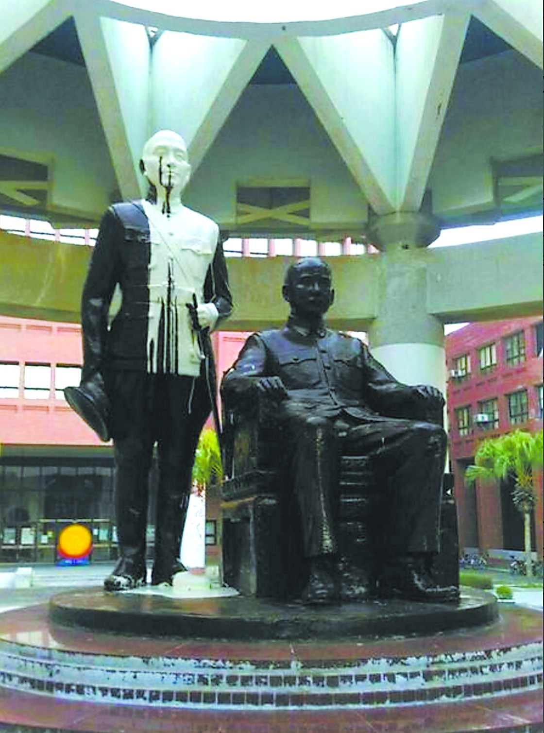 28日,岛内多地蒋介石铜像遭到污损和丑化。《联合报》称,宜兰公园蒋介石铜像遭人喷漆,连带孙中山铜像也被波及。东森新闻称,去年曾在南投向蒋介石铜像涂漆的石育民,28日再度在南投市中兴会堂前,给蒋介石铜像盖上一块白布,看起来就像“披麻戴孝”。
