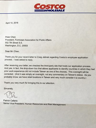 “台湾人公共事务会”在社交网站“脸书”(Facebook)上写到,他们平时都定期会写信给公司、政府机构和组织,“要求”这些单位“停止将台湾指为中国的一个省”。因此,最近有人通报他们好市多也有相同情形,在上个月就写信提醒好市多能够进一步修正。