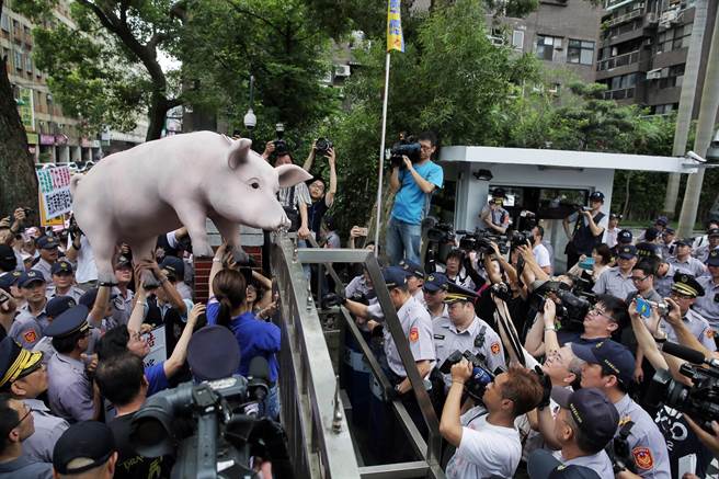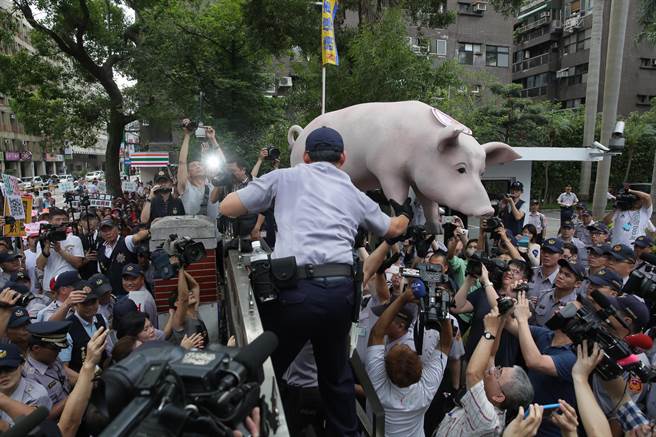猪农激烈抗议高喊“林全下台、毒猪入台”,抬美猪标本翻墙冲进“立法院”。(图片来源:台湾《中时电子报》)