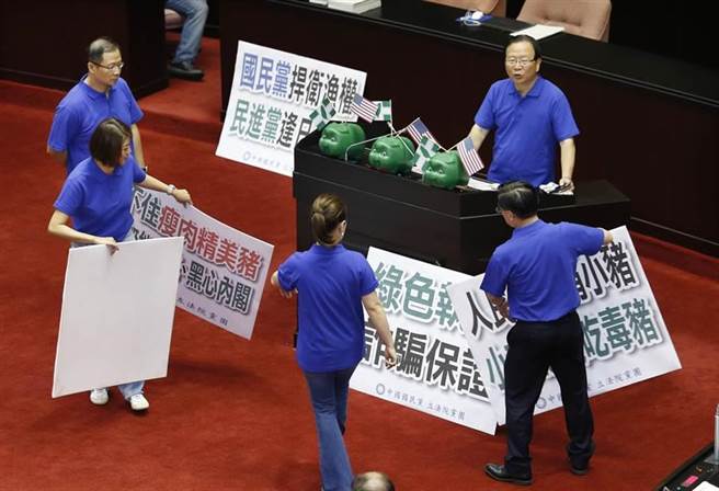 国民党“立委”在“院会”开始前即进入议场占领发言台,准备各式标语,要林全对美猪政策说清楚讲明白,承诺任内不开放美猪。(图片来源:台湾《中时电子报》)