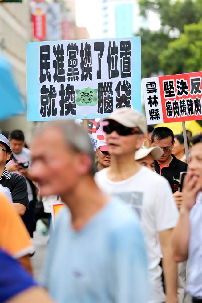 猪农激烈抗议高喊“林全下台、毒猪入台”,抬美猪标本翻墙冲进“立法院”。(图片来源:台湾《中时电子报》)