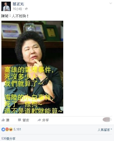 然而,蔡正元昨日(6月30日)在脸谱网发出一张陈菊的照片,并用黄色字体写上“高雄气爆事件死没多少人,我们就算了;海陆的小白事件死了一条狗,这不是道歉就能算。”讽刺高雄市政府的立场根本就是“人不如狗”。