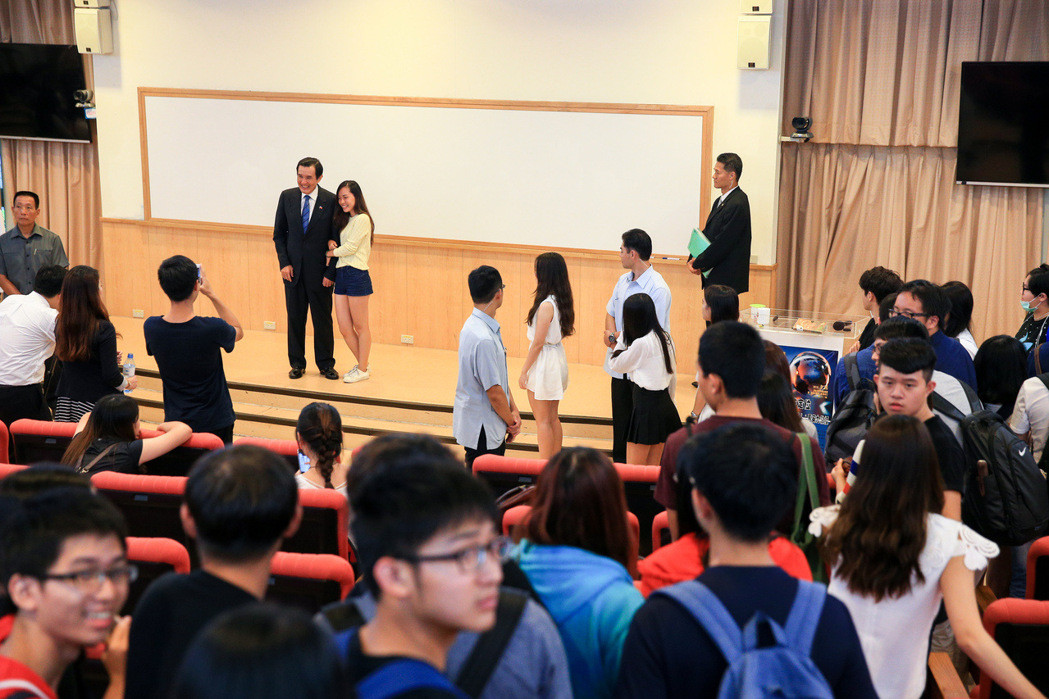 演讲结束后,开放学生与“马老师”合照,吸引学生大排长龙等待合影,POSE从最基本的握手、勾手臂、搭肩膀到拥抱,显示马英九卸任后人气依然不减。