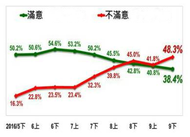 据台媒报道,岛内“指标民调”调查民众对蔡英文执政满意度,最新结果显示,38.4%受访者表示满意,48.3%不满意。对照9月上旬的民调,不满意度增加6.5%,进一步加剧呈现“死亡交叉”。