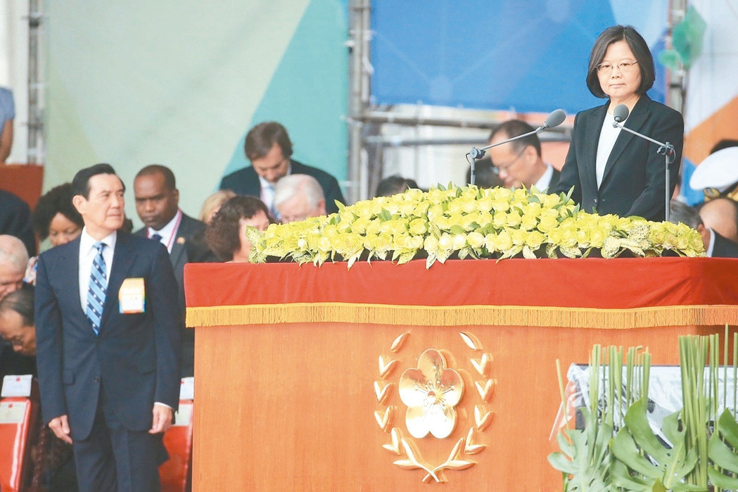 蔡英文上台发表“双十”谈话,马英九起身目视。(图片来源:台湾《联合报》)