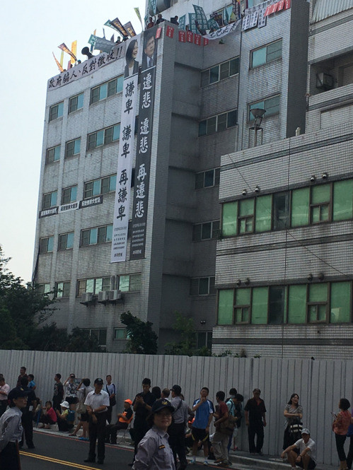 综合台湾《联合报》报道,中台湾反迫迁团体今日在位于火车站旁、计划拆迁的“大智慧”大楼上布署叫阵,并在典礼进行中全力干扰。因为抗议人士都站在大楼上,警方也无可奈何。抗议者用扩音器大喊“林佳龙下台”、“蔡英文请接受我们陈情”,以致仪式司仪主持活动时,不得不用喊的,还几度破音。