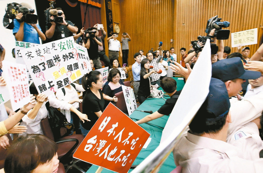 日本食品输台公听会台北场日前在台当局“农粮署”举行,会议没开始就大乱,蓝营民代与民众现场抗议,认为会议名称应改为日本核灾食品输台公听会,现场一片混乱。(图片来源:台湾《联合报》)