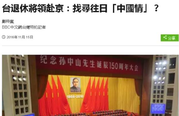 而台湾退役海军中将兰宁利在接受台湾《联合报》采访时也表示,这些老兵之所以会来大陆参加纪念孙中山的活动,很可能就是因为对于台湾当局“去中国化”的不满,希望去对岸找到“中国情”。