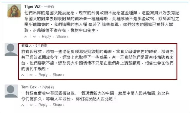 值得注意的是,网友@看戏人 所提出的这些老兵们身上的“大中国情怀”,与之前兰宁利所说的台湾老兵来大陆也是为了寻找“中国情”的观点产生了一种强烈的呼应。
