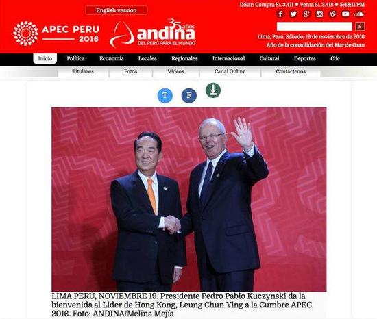 据台湾“联合新闻网”11月20日报道,正在秘鲁举行的亚太经济合作会议(APEC)将于今明两天举行经济领袖会议,亲民党主席宋楚瑜担任台方代表。他与秘鲁总统会面的照片,却被秘鲁新闻通讯社误指为香港特首梁振英。