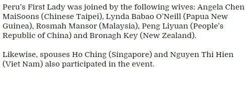秘鲁第一夫人邀请各经济体领袖女眷出席活动,在照片图说当中,将宋镇迈错误写为是宋楚瑜的妻子。