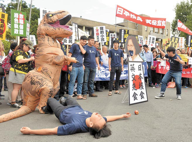 11月18日,国民党号召各县市议员至蔡当局“行政院”抗议日本核灾食品输台,演出行动剧讽刺蔡英文一意孤行。(台湾“中时”报系资料图)