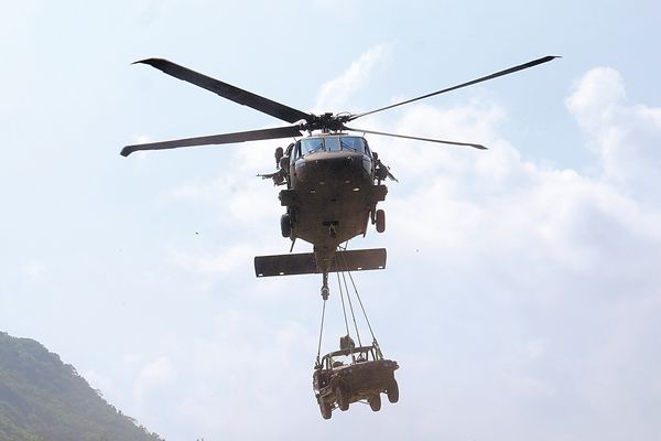 在今年8月台湾“汉光军演”中,一架美制“黑鹰”直升机吊起一辆吉普车。