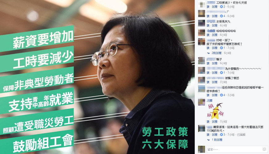 蔡英文于今年5月1日劳动节当天贴出“劳动政策六大主张”的脸书文被网友搜寻出来,纷纷留言“朝圣”,讽刺“跨越时空打脸啰”,也有网友留言:“吹牛文”、“发夹弯”、“工时要减少,砍你七天假”、“网络时代什么都很快,连找出旧图打自己脸的速度也变得更快了”。