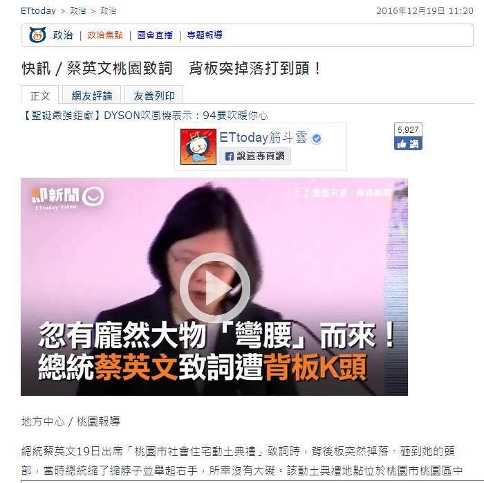 台湾媒体说,随扈见状快速上前将背板扶起,所幸该“肇事”背板材质较软,小英并无大碍,但受到惊吓。