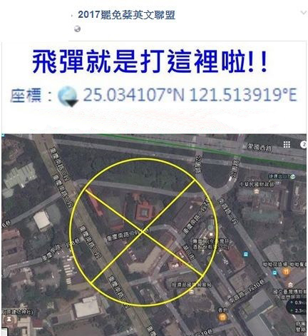 中国台湾网1月4日讯 台湾网友在Facebook成立“2017罢免蔡英文联盟”社团,日前却有人以谷歌地图清楚标示台湾地区领导人蔡英文官邸坐标,并向大陆解放军喊话:“飞弹(导弹)就是打这里(官邸)啦!”,在岛内引发争议。对此,蔡英文办公室于3日晚间作出回应。