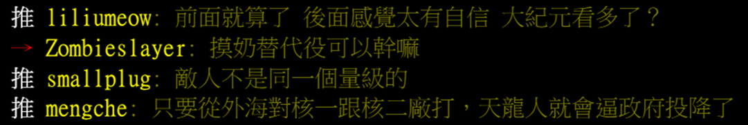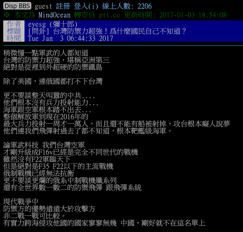 近日,台湾社交媒体PTT(批踢踢实业坊)一篇名为“台湾防御力超强!为什么国民自己不知道”的文章引起了岛内网民的关注,文章里充斥着对台岛防御战的自大情绪,称“除了美国,连俄国都打不下台湾”、“就算没有美日支援,中国要吞下台湾的代价,也是大到他们吃不下去。”而跟帖却更多是在讥讽楼主:“键盘谈兵”、“傻了才一味相信别人一定要为你做什么”。