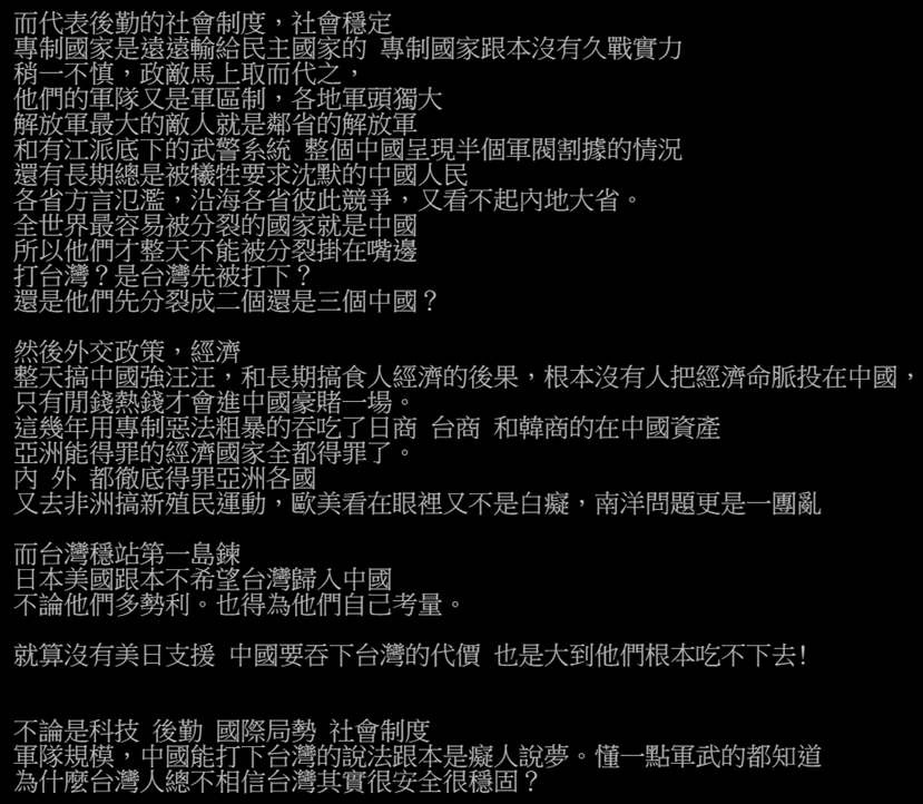 随后文章从社会制度、外交、经济等方面列举了了自己的观点,称“全世界最容易被分裂的国家就是中国,所以他们才整天把不能被分裂挂在嘴边,打台湾?是台湾先被打下?还是他们先分成两个或三个中国?”“根本没有人把经济命脉投在中国,只有闲钱热钱才会进中国豪赌一场。”“亚洲能得罪的经济国家全都得罪了”。