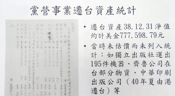 报告书也提到,据1949年12月31日统计,党营事业迁台资产约计77万7598.79美元,换算新台约8.85亿元。另有未估价而未列入统计的设备,如独立出版社运出195件机器、六鲁公司在台部分物资、中华印刷出版公司等。(中国台湾网 王思羽)