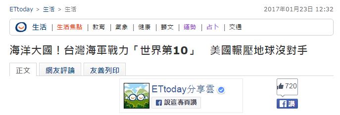 据台湾“东森新闻云”1月23日称,近日,一则外媒评选2017年世界前10强海军的消息在台湾引发热议。据称,台湾名列第10,“属于世界顶尖等级的海洋强权”。