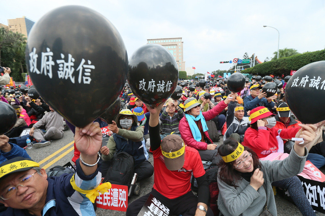 综合台媒1月22日报道,备受台湾岛内关注的年金改革会议22日在台“总统府”举行,近万名台湾退休公职人员来到凯道上,头绑布条、手拿标语抗议改革,并戳破印有“政府诚信”的汽球,象征蔡英文当局诚信破产。