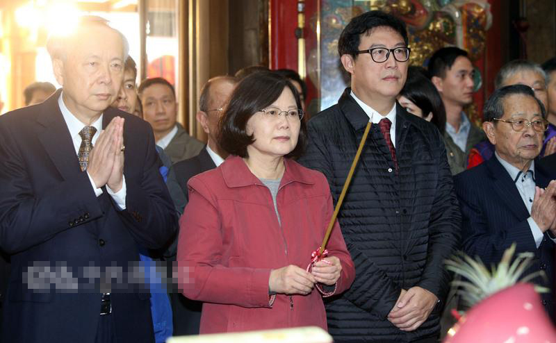据台湾“中央社”报道,蔡英文初一发福袋行程,首站选在台北觉修宫,参加还愿上香祈福及揭匾仪式。蔡约在8时40分抵达,参拜时手持一炷香,庙方人员和其他宾客则双手合十,气氛肃穆庄严。