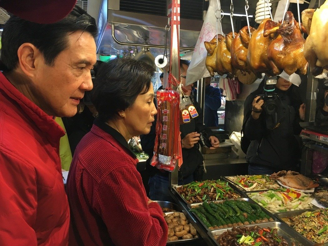 马英九今天在大姊马以南的陪同下,再度来到兴隆市场采购年货,两人依循惯例,向熟识的商家买了水饺、卤味、猪脚等。