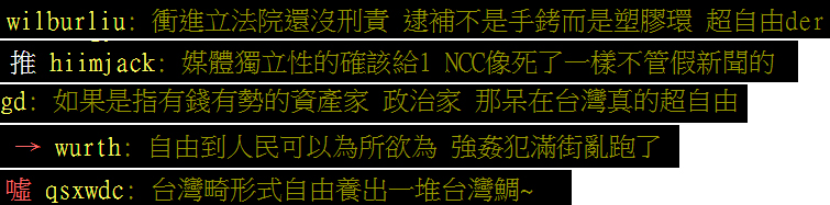 与一些台媒的沾沾自喜形成对比,很多台湾网友对“最自由”持不同看法,在PTT论坛上,一些网友表示“媒体独立性确实该给一级,NCC(国家通讯传播委员会)像死了一样不管假新闻的”、“自由到人民可以为所欲为,强奸犯满街乱跑了”、“冲进‘立法院’还没刑责,逮捕不是手铐而是塑胶环,超自由”、“如果是指有钱有势的资本家、政治家,那呆在台湾真的超自由”。