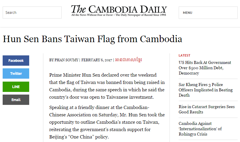 “柬埔寨禁止升台湾‘国旗’”,据多家柬埔寨媒体6日报道,柬首相洪森日前对台湾“国旗”下禁令。