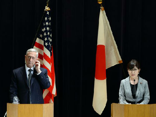 2月4日,在日本东京,美国国防部长马蒂斯(左)与日本防卫大臣稻田朋美共同会见记者。 新华社发
