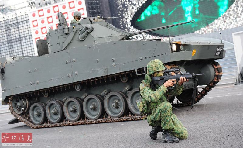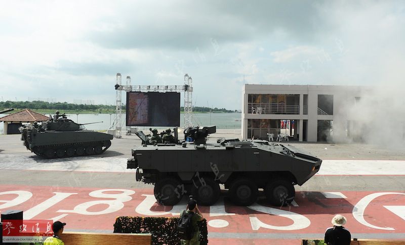 随着经济实力增强,新加坡本土军工产业从上世纪90年代初开始起飞。图为新加坡自行研制的“比奥尼克斯”战车和“特瑞克斯”轮式战车进行协同作战表演。