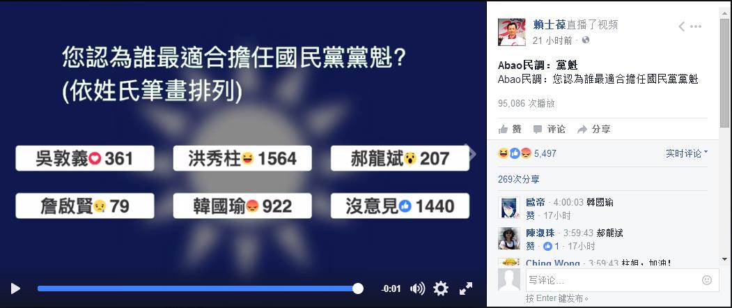 赖士葆此次发起名为“您认为谁最适合担任国民党党魁”的民意调查,用“点赞”的方式让网友表达支持谁。截止到8日中午12点,洪秀柱以1855票大幅领先,第2名为韩国瑜1051票,第3名为吴敦义423票, 之后为郝龙斌240票,詹启贤以98票垫底。