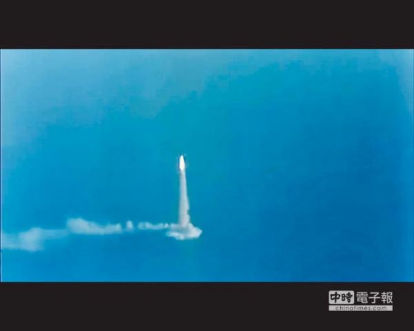 “巨浪-1”洲际弹道导弹破水而出。(图片来源:台湾《旺报》网站截图自《大国倚天长剑》宣传片)