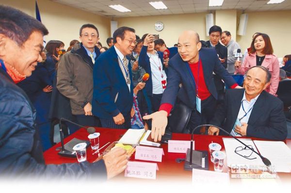 国民党6日举行“拟参选同志座谈会”,邀请主席参选人或参选人代表讨论选举规定。图为参选人韩国瑜(前排右二)在会上与其他代表寒暄。(台湾中时电子报)
