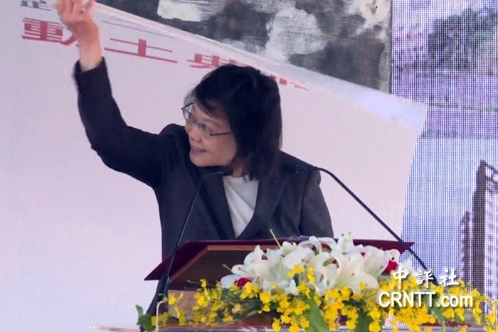 蔡英文2016年12月19日在桃园主持社会住宅开工典礼,瞬间大风,把背后广告牌吹落,软板砸到蔡英文的头,被讽“举头三尺有神明”。(图片来源:中评社)