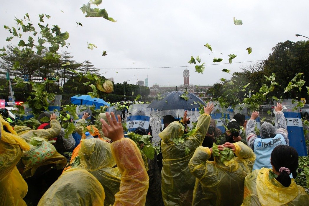 抗议群众向向蔡办投掷一堆“烂菜”,表达心中怒火。(图片来源:台湾《联合报》)