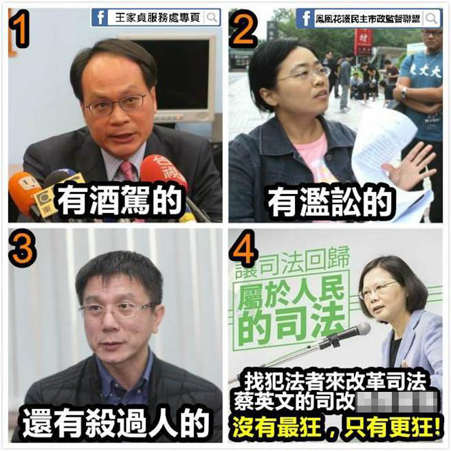 据报道,“凤凰花护民主市政监督联盟”Facebook粉丝页特为此事整理制作出图表,上写:找犯法者来改革司法,蔡英文的司改会议没有最狂,只有更狂!图表中直接在“时代力量”创党大将林峯正照片上标记“有酒驾的”;在中正大学法律系教授卢映洁照片上标记“有滥讼的”;在昔日知名财经律师刘北元照片上标记“还有杀过人的”。
