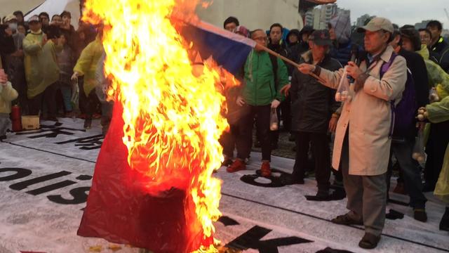 蔡丁贵“228”率众大闹中正纪念堂,烧旗并责骂蔡英文,被移送法办。(台媒图)