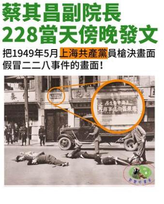 文传会文传会副主委毛嘉庆表示,在被爆图片有误后,蔡其昌也马上下架、删文,但随后又换上一张发生在228的照片,内容为暴民闯入专卖局台北分局打死2人、殴伤4人的照片。