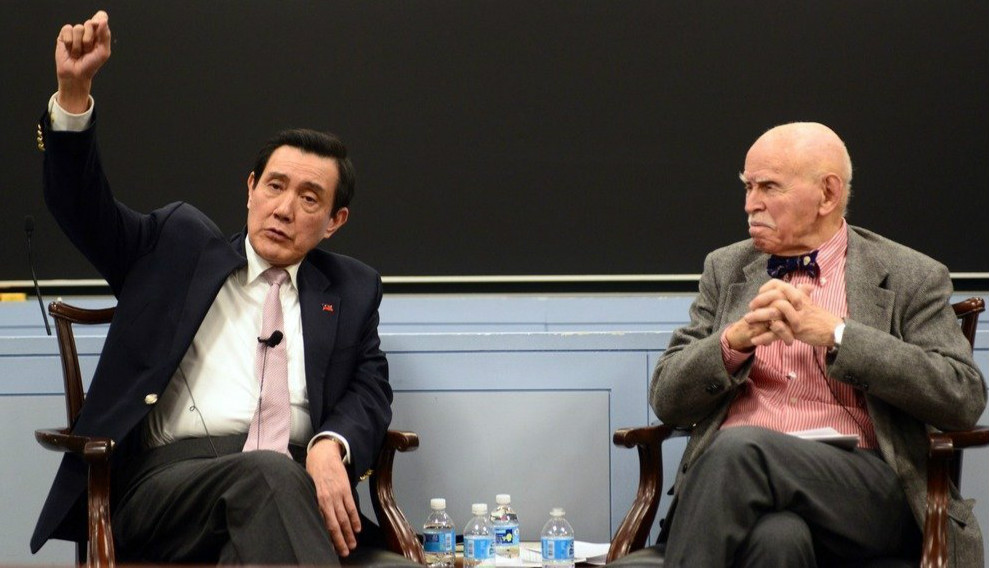 马英九(左)2日应邀在纽约大学法学教授孔杰荣的课堂上座谈(图片来源:台“联合新闻网”)