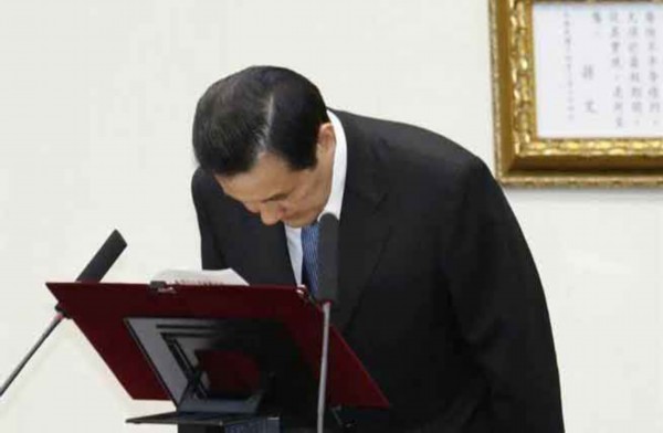 2014年12月3日,国民党九合一选举惨败,马英九辞去国民党党主席职务,并鞠躬致歉。(图片来源:台“中时电子报”)