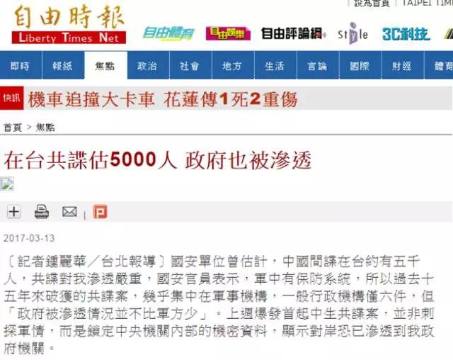 台湾《自由时报》:“在台共谍估5000人 政府也被渗透”↓