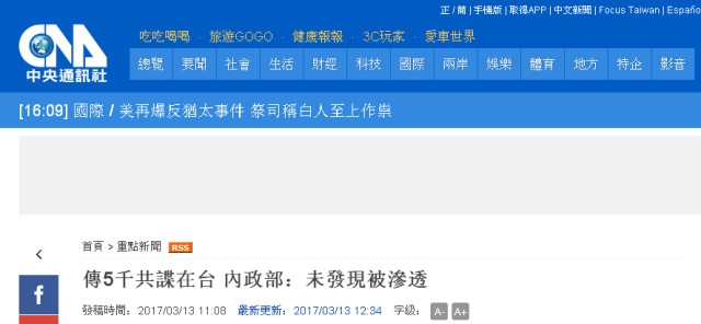 台湾“中央社”:“传5000共谍在台 ‘内政部’:未发现被渗透”↓