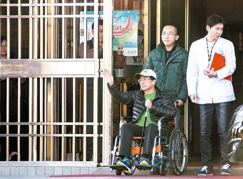 陈水扁保外就医,由儿子陈致中推着轮椅出监。(图片来源:台湾《联合报》)