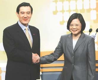 前台湾地区领导人马英九和台湾地区领导人蔡英文握手(图片来源:台“联合报”)