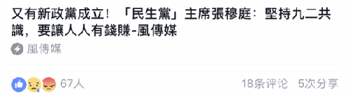 民生党成立当天,张穆庭在脸书上贴出了有关政党成立大会的台媒报道截图,但是评论者与关注者都不多。