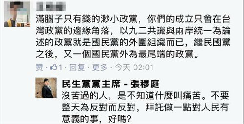 参考消息网-锐参考发现脸书评论中有支持张穆庭成立“经济政党”的留言,也有不少讽刺和挖苦他“坚持‘九二共识’,完成国家统一”的留言。比如,有台湾网友直呼:“你这叫从政啊?!直接去大陆就可以了。”还有网友酸民生党的理念:“这不过是国民党的外围组织嘛。”