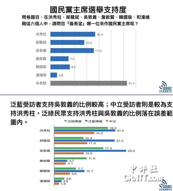 即将于2017年5月20日举行的国民党主席是由合格党员投票,因此,全民调仅具参考价值。不过,该民调结果显示,泛蓝受访者支持吴敦义比例较高,中立支持者较支持洪秀柱,泛绿民众支持洪秀柱与吴敦义落在误差范围内,间接显示吴占优势。