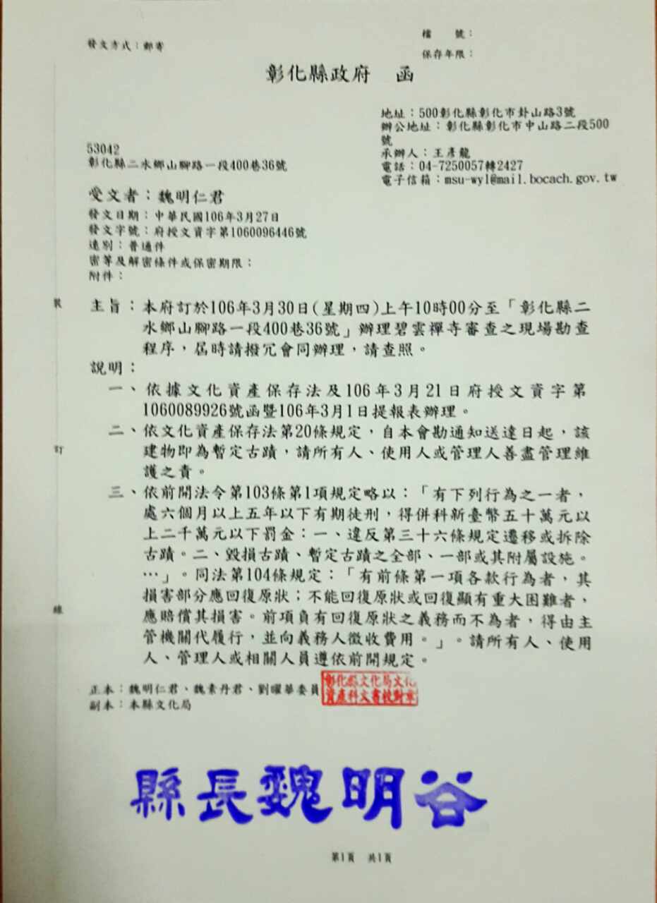 据亲绿的“自由电子报”报道,3月30日,彰化县政府文化局和建设处到场勘查,遭到爱国基地人员的阻拦,双方起了冲突。现场虽有警察,但未有强势作为,结果一名寺方人员把一顶棒球帽丢到“文化局长”陈文彬的头部,继而发生拉址。整个勘查最后完成,县政府准备把后殿的旧碧云禅寺列为“暂定古迹”。而前殿新盖的部分,疑似没有执照,属于违章建筑,要求自行拆除。